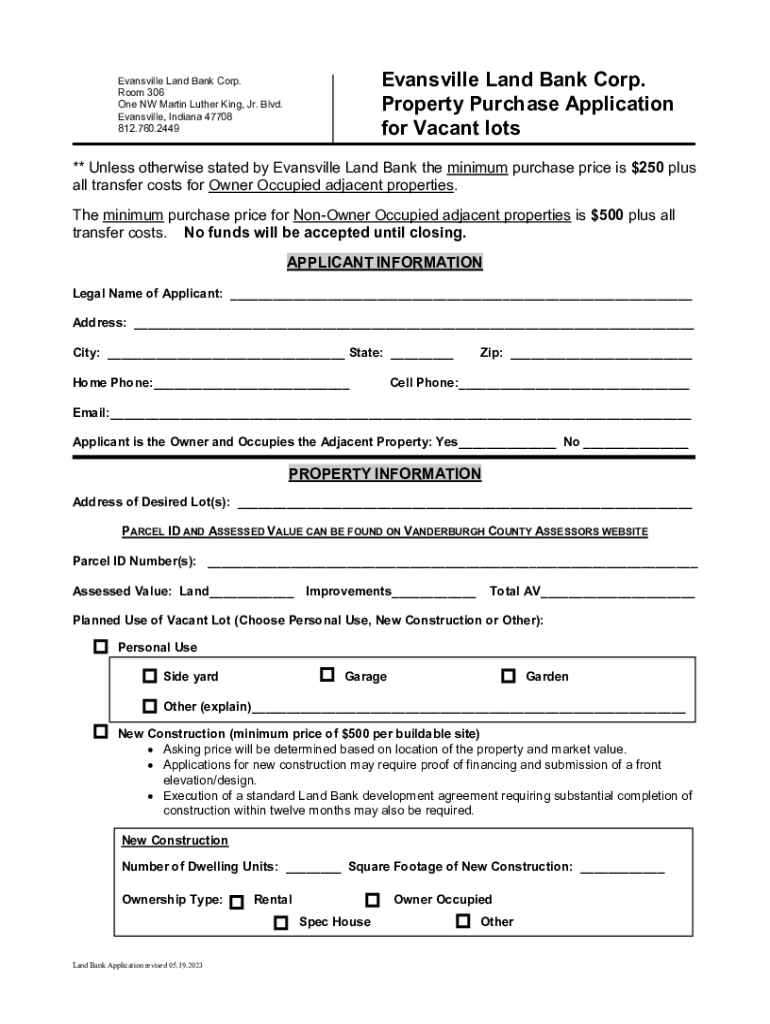 Evansville Land Bank Corp. Property Purchase Application for Vacant lots Evansville Land Bank Corp. Room 306 One NW Martin Luther King, Jr. Blvd. Evansville, Indiana 47708 812.760.2449** Unless otherwise