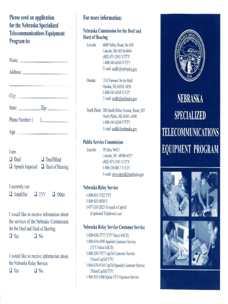 Please send an application for the Nebraska Specialized Telecommunications Equipment Program to:For more information: Nebraska Commission for the Deaf and Hard of Hearing Lincoln:Name: _ _ _ _ __
