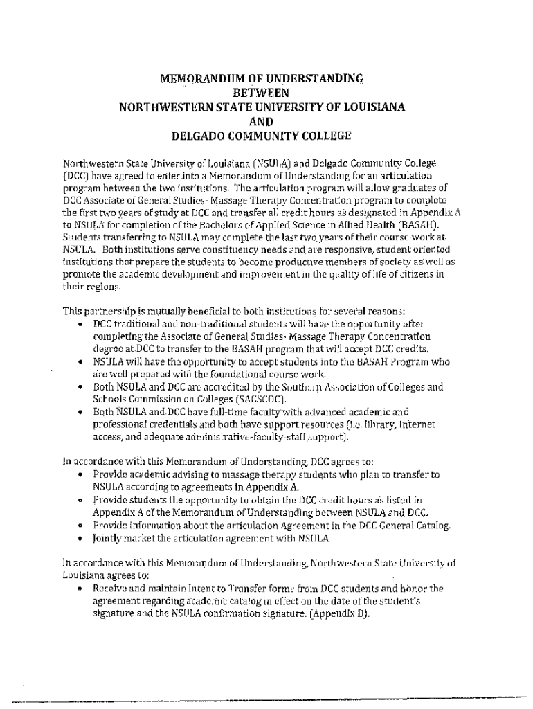 MEMORANDUM OF UNDERSTANDING BETWEEN NORTHWESTERN STATE UNIVERSITY OF LOUISIANA AND DELGADO COMMUNITY COLLEGE Northwestern State University of Louisiana (INSULA) and Delgado Community College (DCC)
