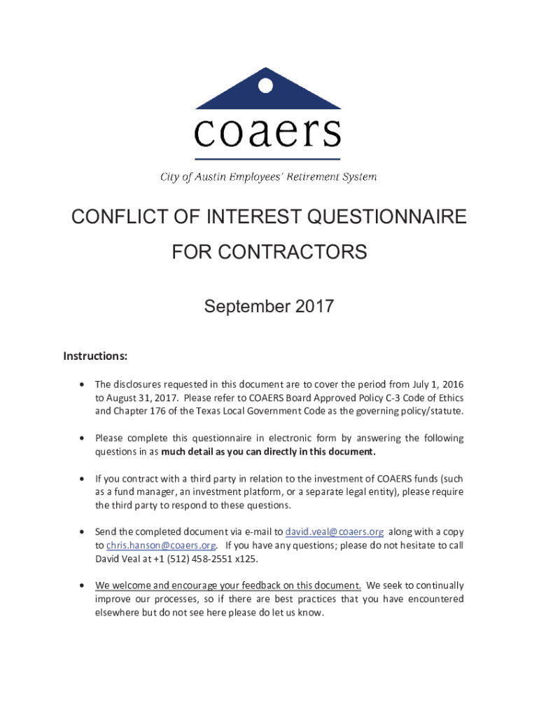CONFLICT OF INTEREST QUESTIONNAIRE FOR CONTRACTORS September 2017 Instructions: xx xxxThedisclosuresrequestedinthisdocumentaretocovertheperiodfromJuly1,2016 toAugust31,2017. PleaserefertoCOAERSBoardApprovedPolicyC3CodeofEthics