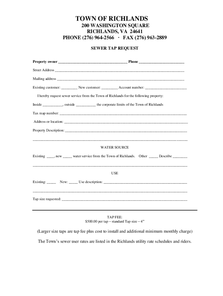 TOWN OF RICHLAND 200 WASHINGTON SQUARE RICHLAND, VA 24641 PHONE (276) 9642566 FAX (276) 9632889 SEWER TAP REQUEST Property owner ___ Phone ___ Street Address ___ Mailing address ___ Existing customer: