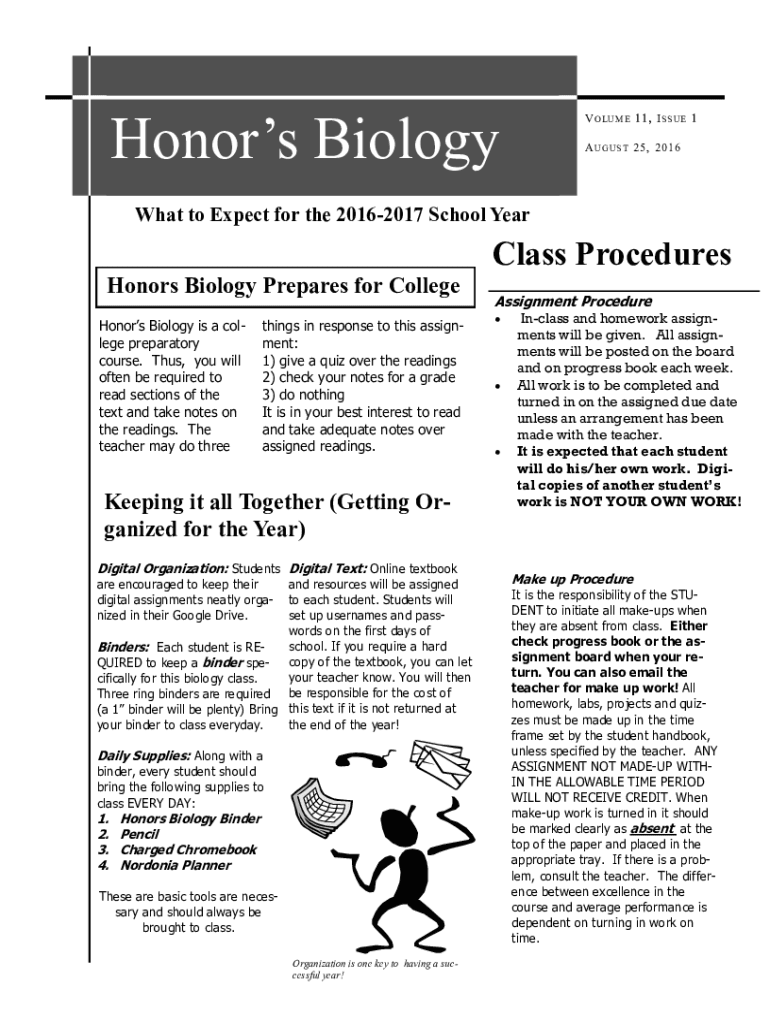 Honors Biology O LUMEN ISSUE U GUST 25, 2016What to Expect for the 20162017 School Fearless Procedures Honors Biology Prepares for College Honors Biology is a college preparatory course. Thus, you