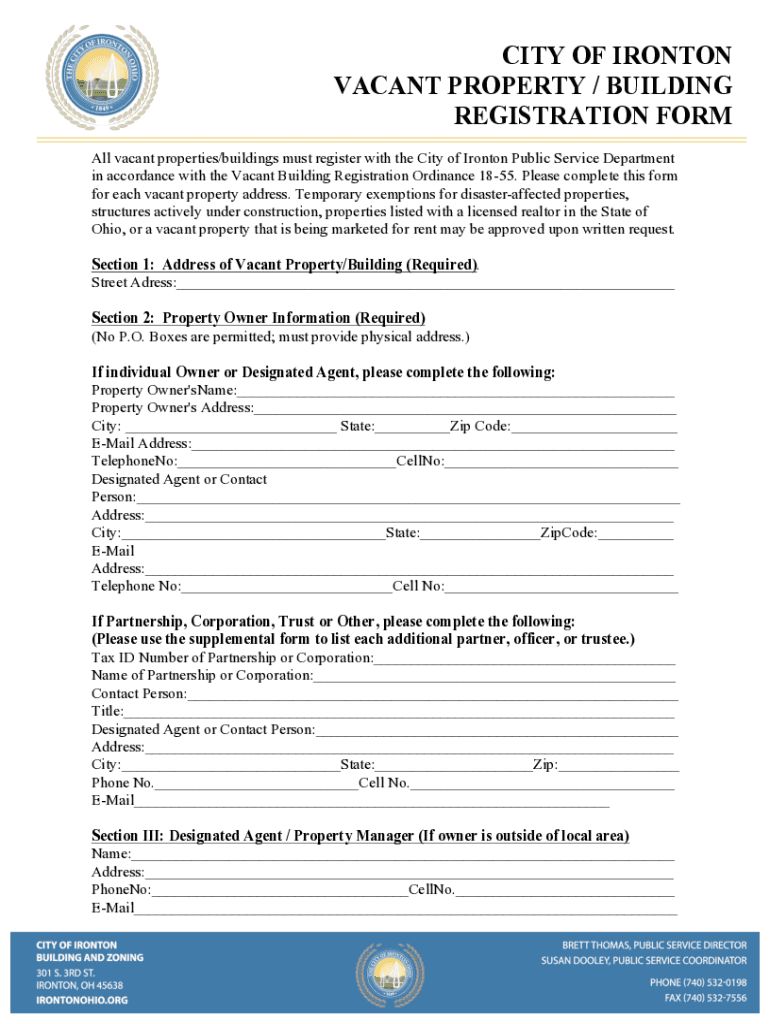 CITY OF PROTON VACANT PROPERTY / BUILDING REGISTRATION FORM All vacant properties/buildings must register with the City of Iron ton Public Service Department in accordance with the Vacant Building
