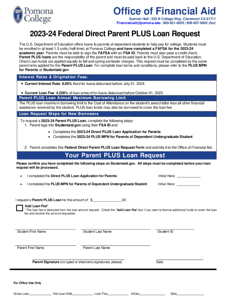Office of Financial Aid Sumner Hall | 333 N College Way, Claremont CA 91711 Financial.aid@pomona.edu | 9096218205 | 9096079842 (fax)202324 Federal Direct Parent PLUS Loan Request The U.S. Department