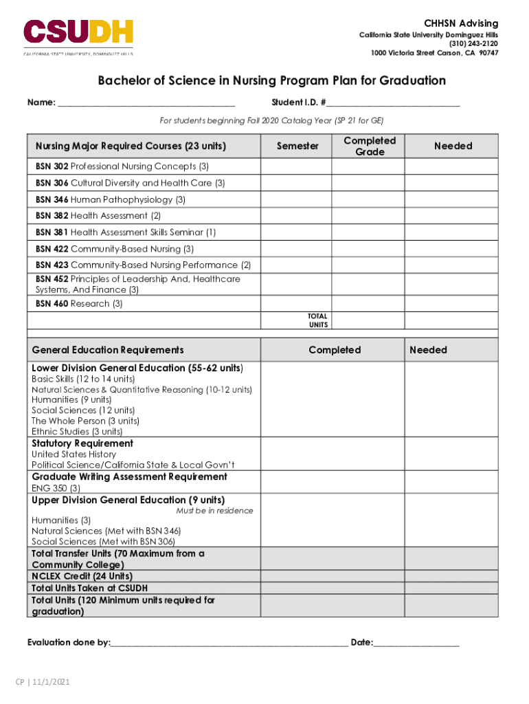 CHH SN Advising California State University Dominguez Hills (310) 2432120 1000 Victoria Street Carson, CA 90747Bachelor of Science in Nursing Program Plan for Graduation Name: ___Student I.D. #___For