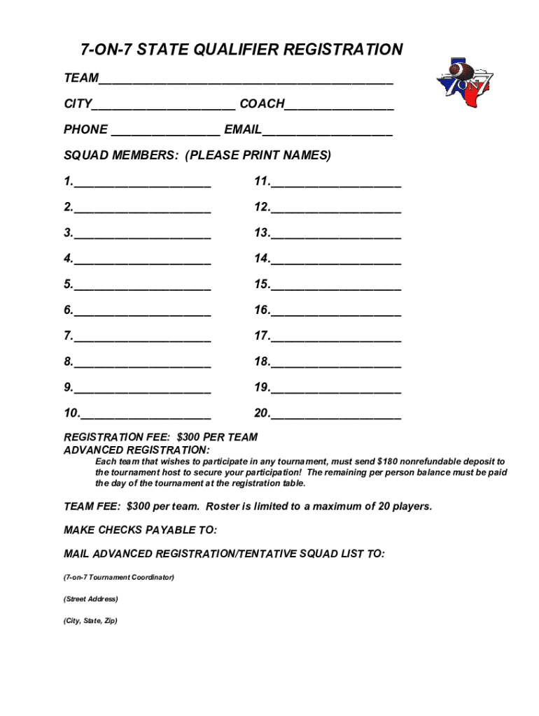 7ON7 STATE QUALIFIER REGISTRATION TEAM___ CITY___ COACH___ PHONE ___ EMAIL___ SQUAD MEMBERS: (PLEASE PRINT NAMES) 1.___11.___2.___12.___3.___13.___4.___14.___5.___15.___6.___16.___7.___17.___8.___18.___9.___19.___10.___20.___REGISTRATION
