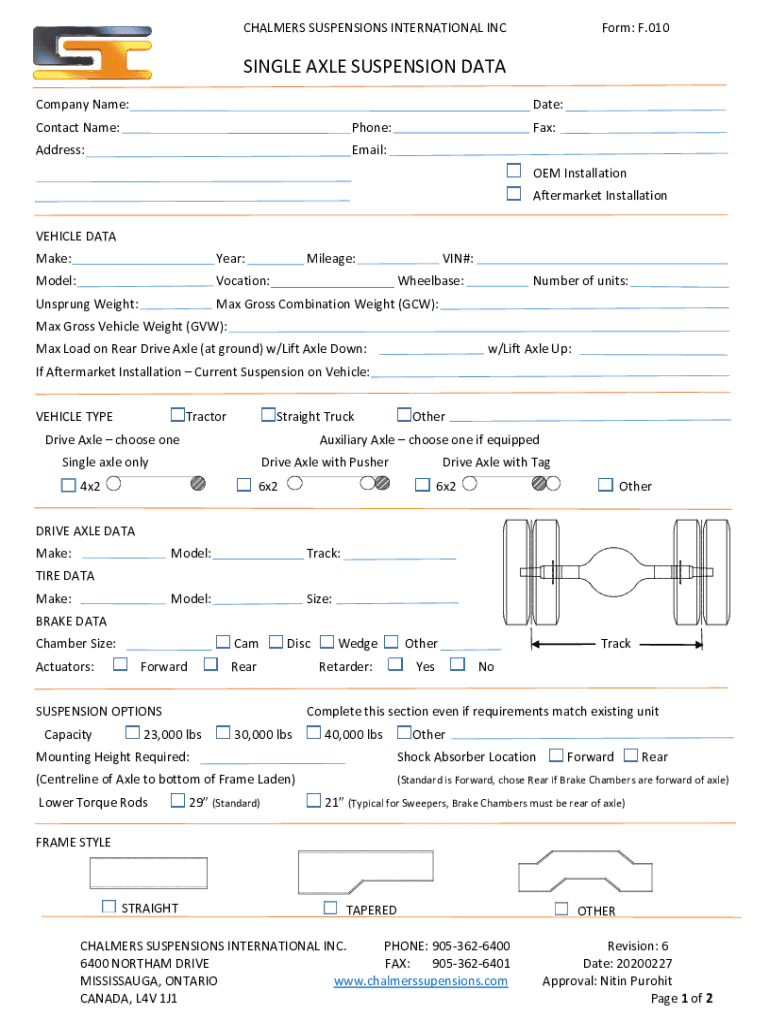 CHALMERS SUSPENSIONS INTERNATIONAL Inform: F.010SINGLE AXLE SUSPENSION DATA Company Name:Date:Contact Name:Phone:Address:Email:Fax: OEM Installation Aftermarket InstallationVEHICLE DATA Make:Year:Mileage:VIN#:Model:Vocation:Unstrung