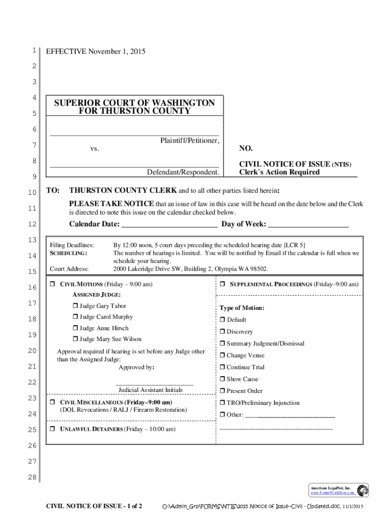 1EFFECTIVE November 1, 20152 3 4 5 6 7 8 9 10SUPERIOR COURT OF WASHINGTON FOR THURSTON COUNTY ___ Plaintiff/Petitioner, vs.NO.___ Defendant/Respondent.CIVIL NOTICE OF ISSUE (OTIS) Clerks Action Required
