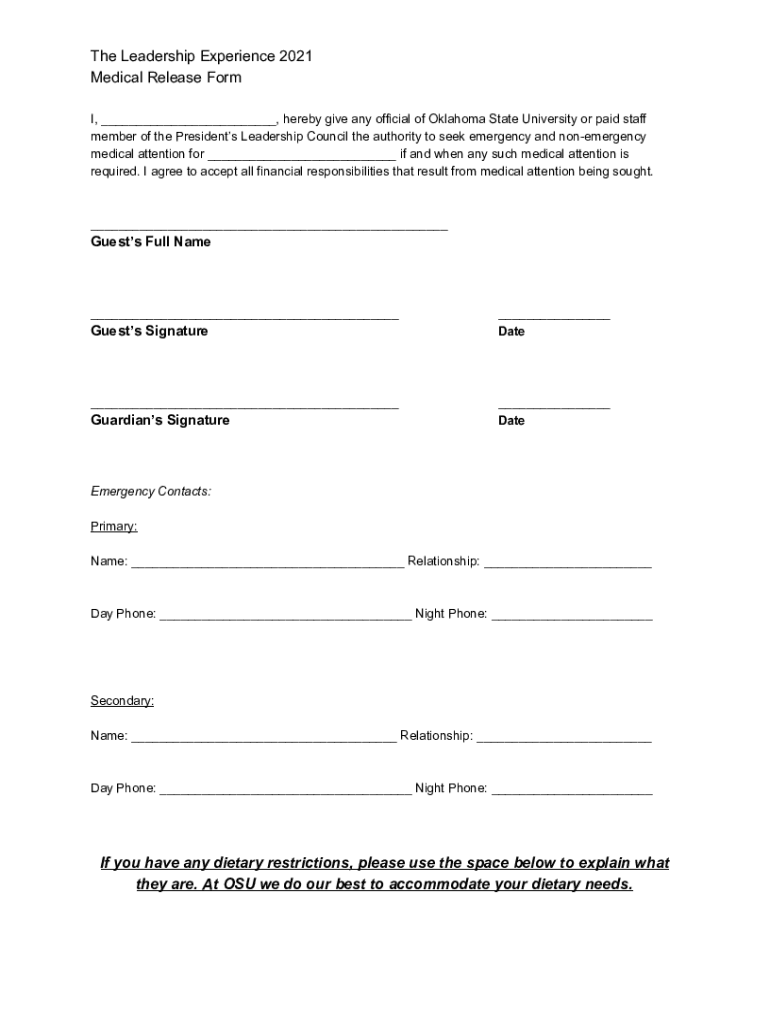 The Leadership Experience 2021 Medical Release Form I, ___, hereby give any official of Oklahoma State University or paid staff member of the Presidents Leadership Council the authority to seek emergency