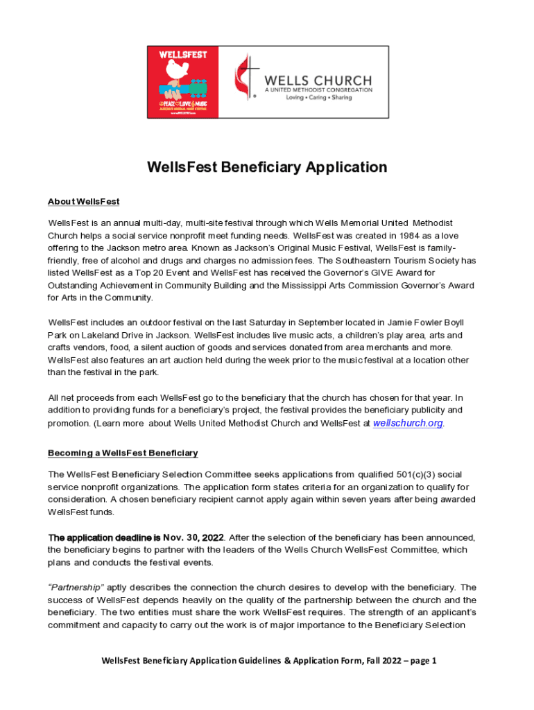 Welles Beneficiary Application About WellsFestWellsFest is an annual multiday, multisite festival through which Wells Memorial United Methodist Church helps a social service nonprofit meet funding