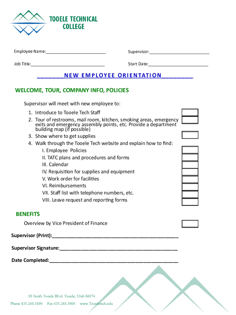 Employee Name:___Supervisor:___Job Title:___Start Date:____ _ _ _ _ _ _ N E W E M P L O Y E E O R I E N TAT I O N _ _ _ _ _ _ _ _ WELCOME, TOUR, COMPANY INFO, POLICIES Supervisor will meet with new