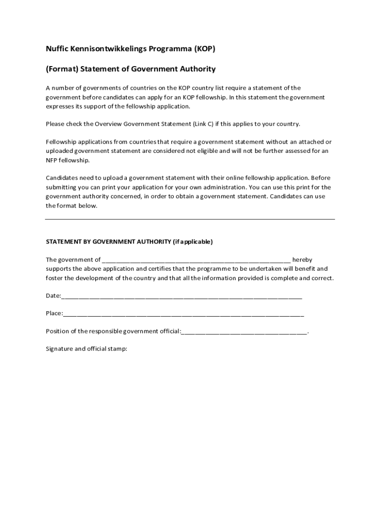 Suffix Kennisontwikkelings Programma (KOP) (Format) Statement of Government Authority A number of governments of countries on the KOP country list require a statement of the government before candidates
