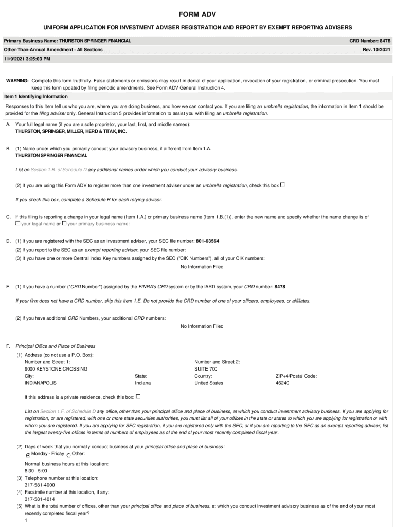 FORM ADV UNIFORM APPLICATION FOR INVESTMENT ADVISER REGISTRATION AND REPORT BY EXEMPT REPORTING ADVISERS Primary Business Name: THURSTON SPRINGER FINANCIAL CRD Number: 8478OtherThanAnnual Amendment