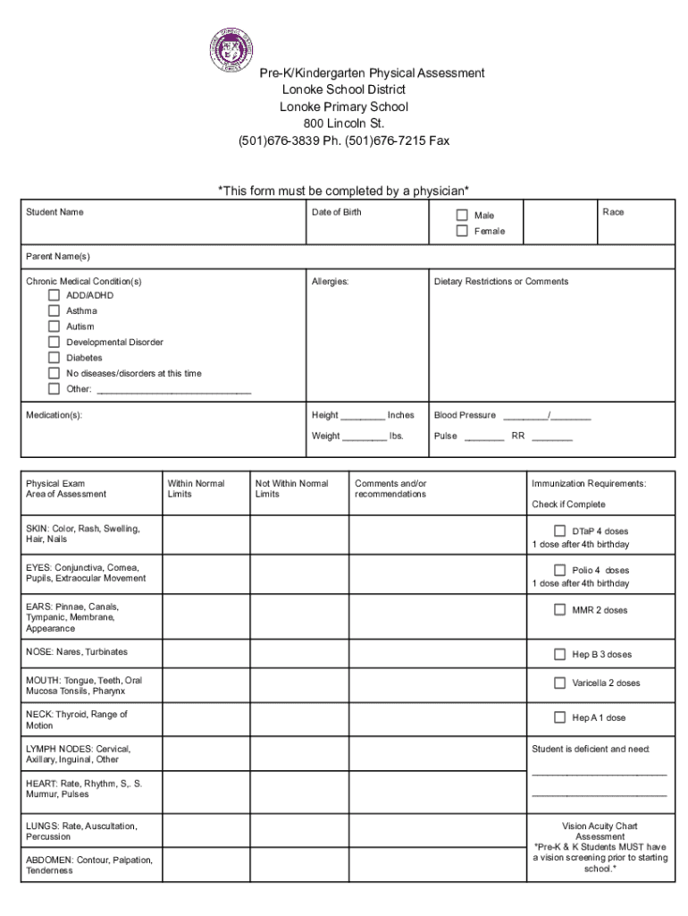 Children who are enrolling in pre-k or kindergarten programs typically need to submit a physical assessment form as part of the enrollment process.