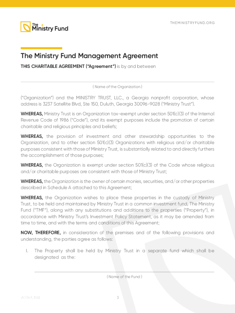 The Ministry Fund Agreement Packet I N I ST RY T R U ST, L LC 323 7 S AT E L L I T E B LV D, ST E 1 50 D U L U T H, GA 3 0 0 96 9028 P : 470.851. 23 6 6 E : C O N TACT U S AT H E M I N I ST RY F U