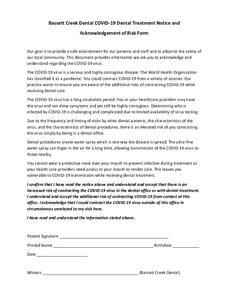 Bassett Creek Dental COVID-19 Dental Treatment Notice acknowledgement of Risk Former goal is to provide a safe environment for our patients and staff and to advance the safety four local community. This document provides information we ask you to acknowledge and