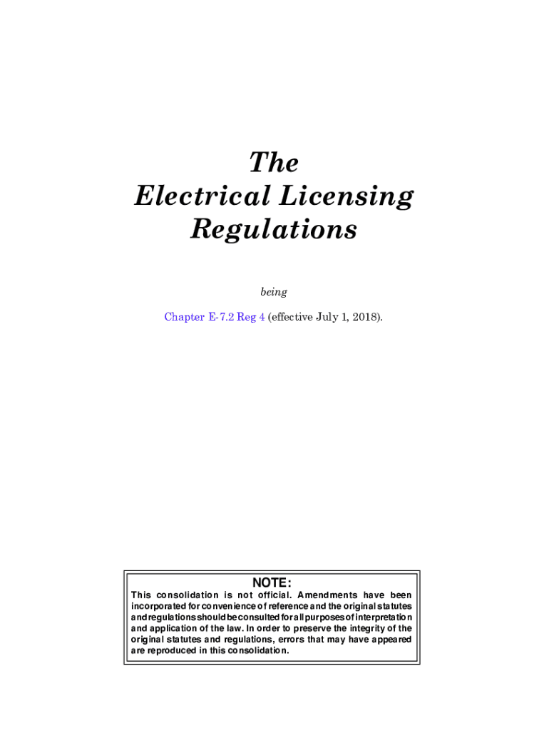 1 ELECTRICAL LICENSINGE7.2 REG 4The Electrical Licensing Regulations being Chapter E7.2 Reg 4 (effective July 1, 2018).NOTE:This consolidation is not official. Amendments have been incorporated for