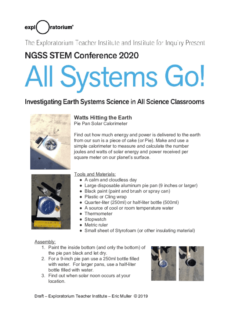 Watts Hitting the Earth Pie Pan Solar Calorimeter Find out how much energy and power is delivered to the earth from our sun is a piece of cake (or Pie). Make and use a simple calorimeter to measure