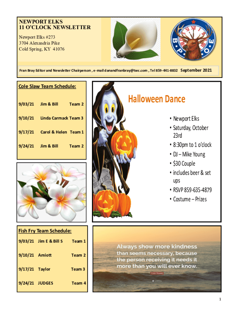 NEWPORT ELKS 11 O'CLOCK NEWSLETTER Newport Elks #273 3704 Alexandria Pike Cold Spring, KY 41076Fran Bray Editor and Newsletter Chairperson, email danandfranbray@twc.com, Tel 8594418832September 2021Cole