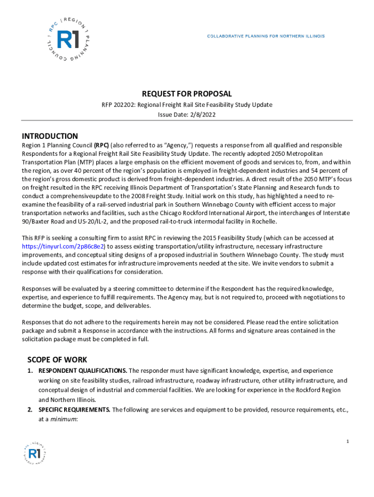 REQUEST FOR PROPOSAL RFP 202202: Regional Freight Rail Site Feasibility Study Update Issue Date: 2/8/2022INTRODUCTIONRegion 1 Planning Council (RPC) (also referred to as Agency, ) requests a response