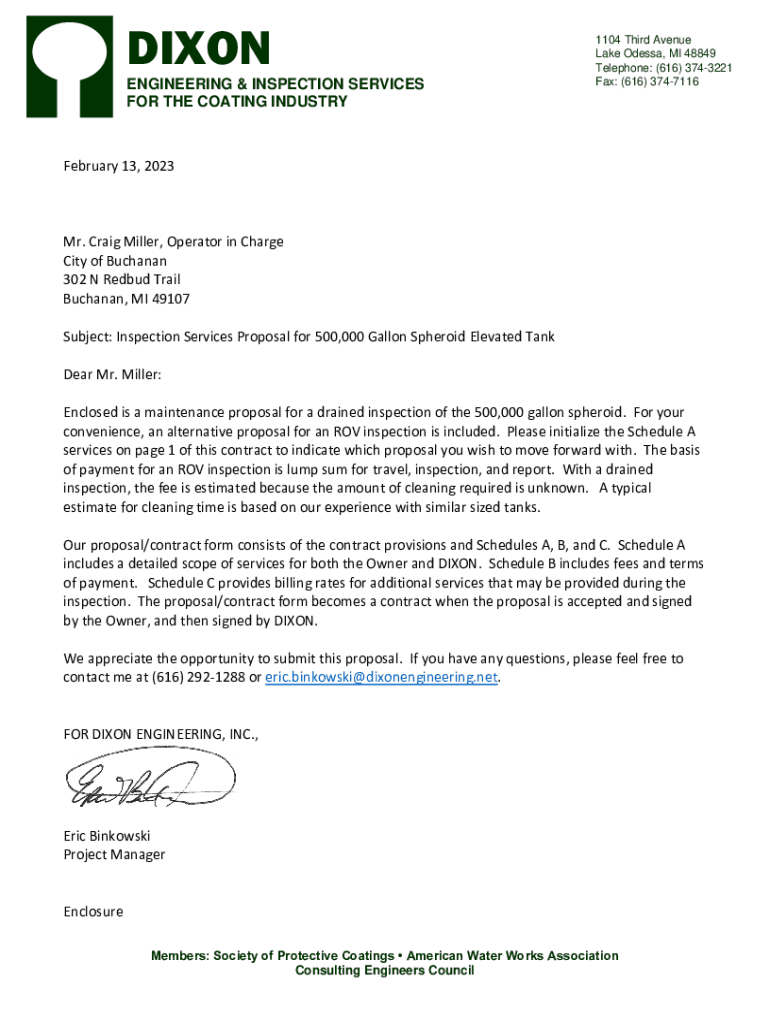 DIXON ENGINEERING & INSPECTION SERVICES FOR THE COATING INDUSTRY1104 Third Avenue Lake Odessa, MI 48849 Telephone: (616) 3743221 Fax: (616) 3747116February 13, 2023Mr. Craig Miller, Operator in Charge