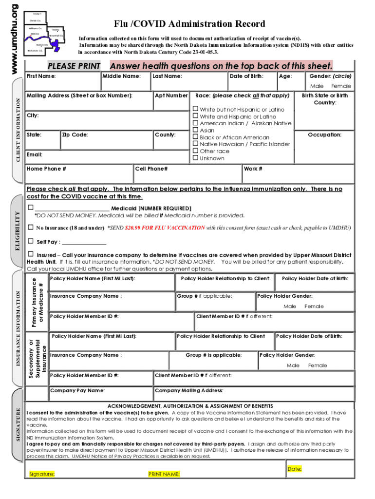 Flu /COVID-19 Administration Record Information collected on this form will be used to document authorization of receipt of vaccine(s). Information may be shared through the North Dakota Immunization