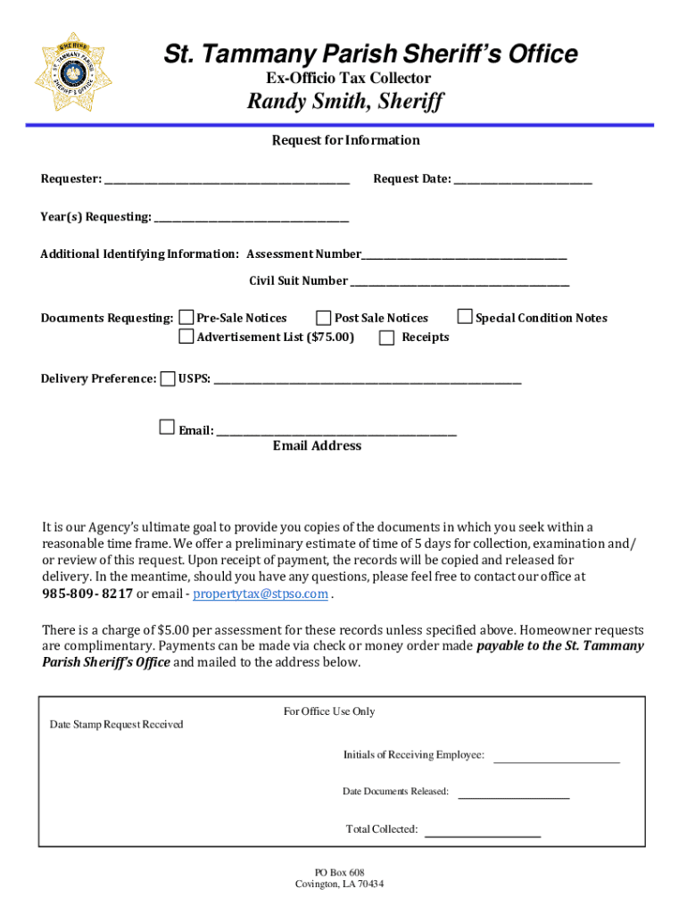 St. Tammany Parish Sheriffs Office Ex-officio Tax Collector Randy Smith, Sheriff Request for Information Requester: ___Request Date: ___Year(s) Requesting: ___ Additional Identifying Information: