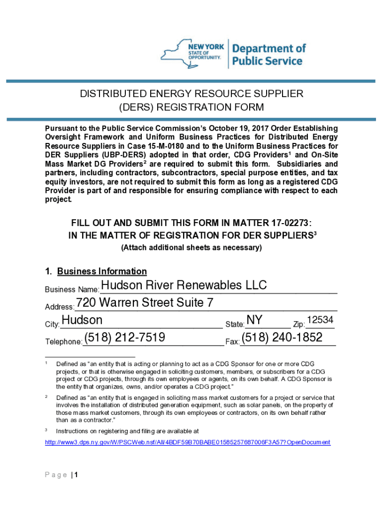 DISTRIBUTED ENERGY RESOURCE SUPPLIER (HERS) REGISTRATION FORM Pursuant to the Public Service Commissions October 19, 2017, Order Establishing Oversight Framework and Uniform Business Practices for