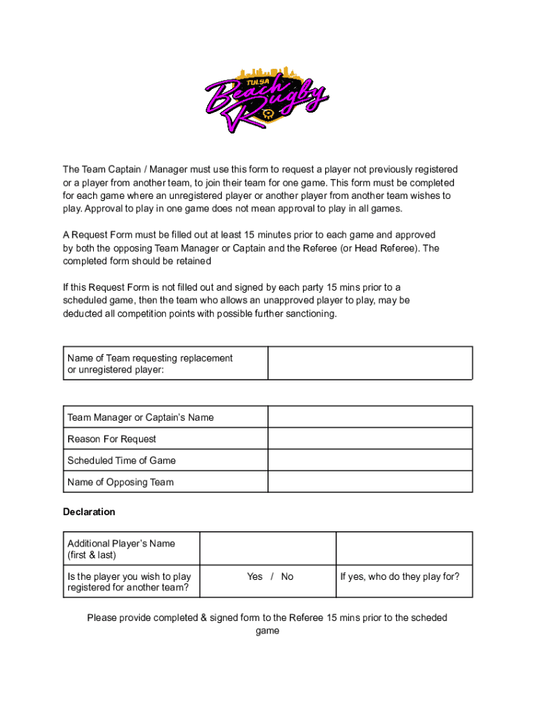 The Team Captain / Manager must use this form to request a player not previously registered or a player from another team, to join their team for one game. This form must be completed for each game