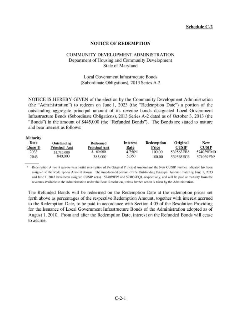 Schedule C2NOTICE OF REDEMPTION COMMUNITY DEVELOPMENT ADMINISTRATION Department of Housing and Community Development State of Maryland Local Government Infrastructure Bonds (Subordinate Obligations),