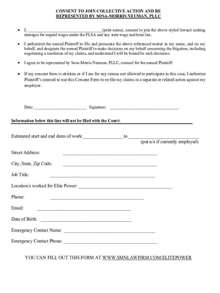 CONSENT TO JOIN COLLECTIVE ACTION AND BE REPRESENTED BY SOSAMORRIS NEWMAN, LLC I, ___(print name), consent to join the above styled lawsuit seeking damages for unpaid wages under the FLEA and any