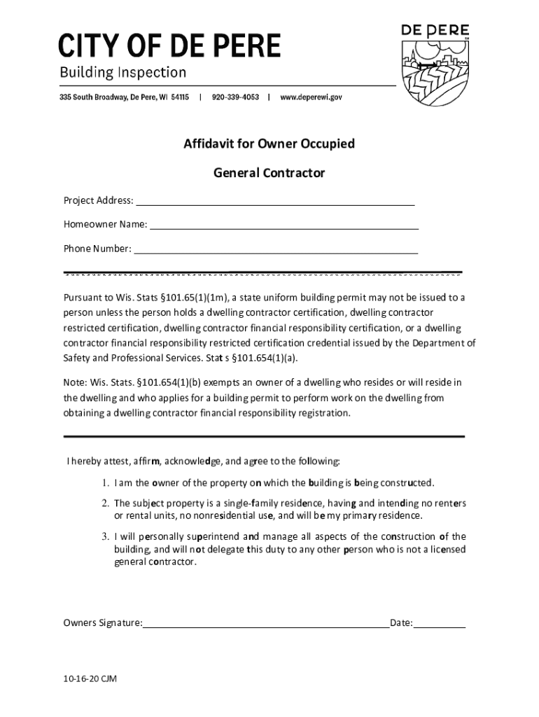 Affidavit for Owner Occupied General Contractor Project Address: ___ Homeowner Name: ___ Phone Number: ___Pursuant to Wis. Stats 101.65(1)(1 m), a state uniform building permit may not be issued