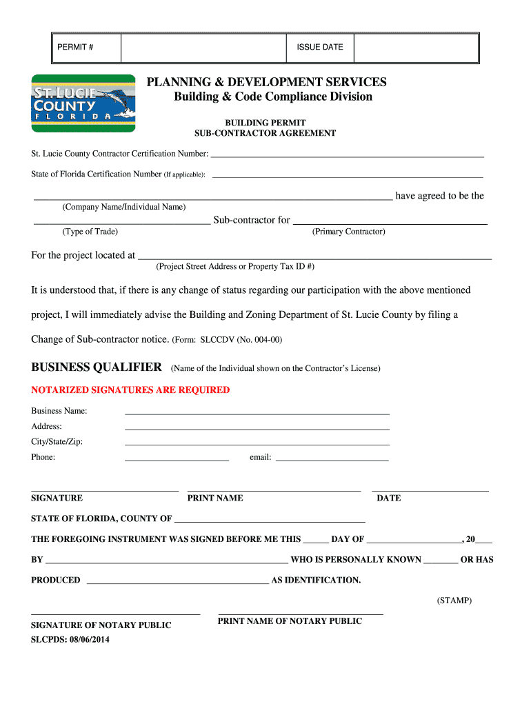 PERMIT # ISSUE DATE PLANNING & DEVELOPMENT SERVICES Building & Code Compliance Division BUILDING PERMIT SUB-CONTRACTOR AGREEMENT St. Lucie County Contractor Certification Number: State of Florida