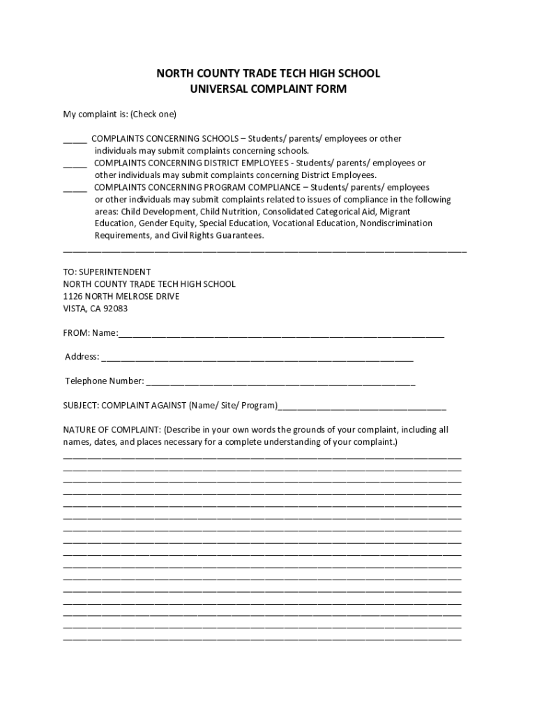 NORTH COUNTY TRADE TECH HIGH SCHOOL UNIVERSAL COMPLAINT FORM My complaint is: (Check one) ___ COMPLAINTS CONCERNING SCHOOLS Students/ parents/ employees or other individuals may submit complaints