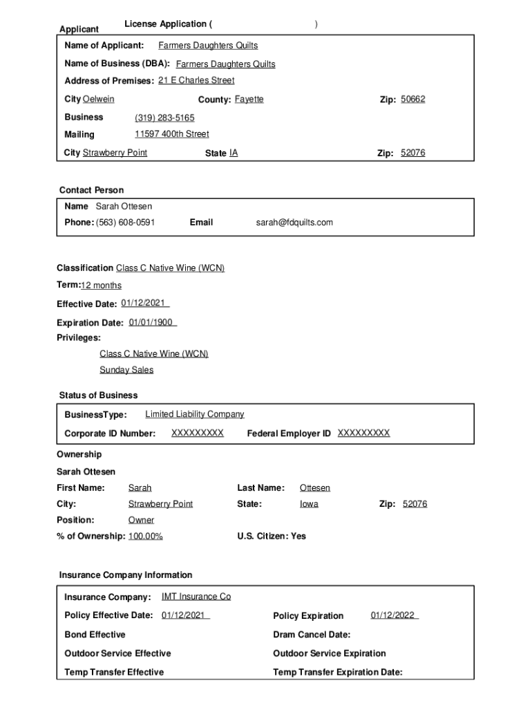 License Application (ApplicantName of Applicant:)Farmers Daughters QuiltsName of Business (DBA): Farmers Daughters Quilts Address of Premises: 21 E Charles Street City Oilman County: Fayette : Business