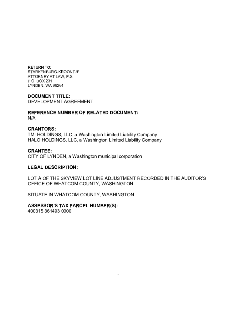 RETURN TO: STARKENBURGKROONTJE ATTORNEY AT LAW, P.S. P.O. BOX 231 LYNDON, WA 98264DOCUMENT TITLE: DEVELOPMENT AGREEMENT REFERENCE NUMBER OF RELATED DOCUMENT: N/A GRANTERS: TMI HOLDINGS, LLC, a Washington