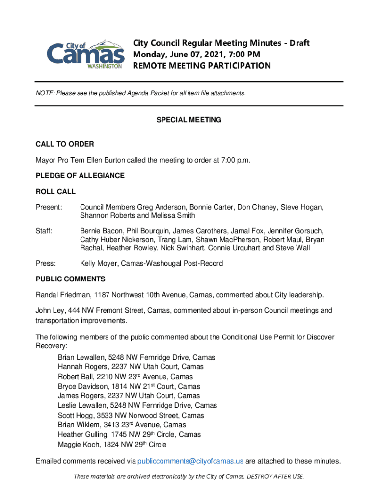 City Council Regular Meeting Minutes Draft Monday, June 07, 2021, 7:00 PM REMOTE MEETING PARTICIPATION NOTE: Please see the published Agenda Packet for all item file attachments. SPECIAL MEETING CALL