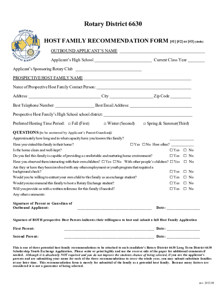 Rotary District 6630 HOST FAMILY RECOMMENDATION FORM [#1] [#2] or [#3] (circle) OUTBOUND APPLICANTS NAME ___ Applicants High School ___ Current Class Year ___ Applicants Sponsoring Rotary Club ___