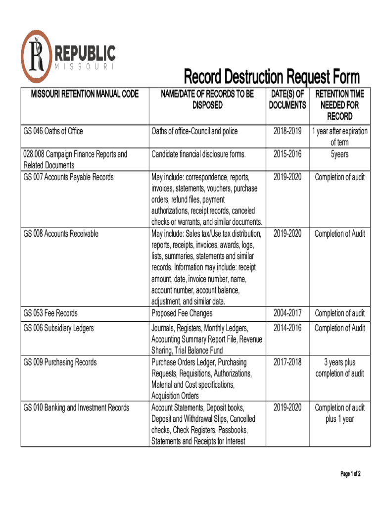 Record Destruction Request Form MISSOURI RETENTION MANUAL CODES 046 Oaths of Officiates of officeCouncil and police20182019028.008 Campaign Finance Reports and Related Documents GS 007 Accounts Payable