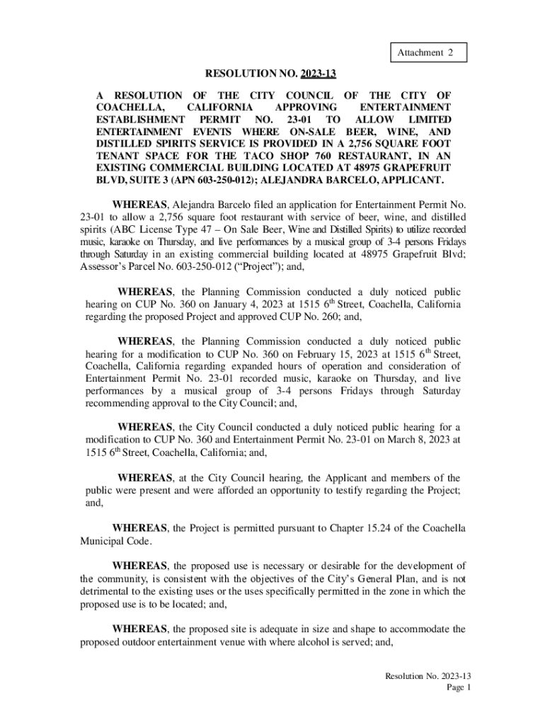 Attachment 2RESOLUTION NO. 202313 A RESOLUTION OF THE CITY COUNCIL OF THE CITY OF COACHELLA, CALIFORNIA APPROVING ENTERTAINMENT ESTABLISHMENT PERMIT NO. 2301 TO ALLOW LIMITED ENTERTAINMENT EVENTS