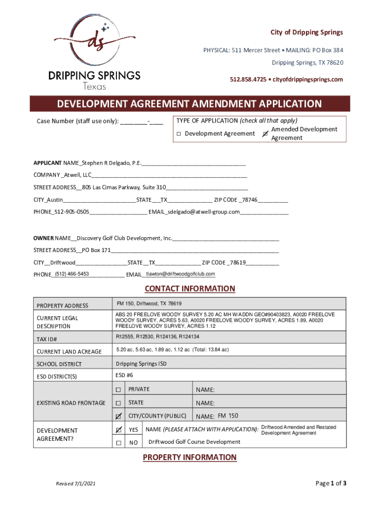 512.858.4725 cityofdrippingsprings. Development AGREEMENT AMENDMENT APPLICATION