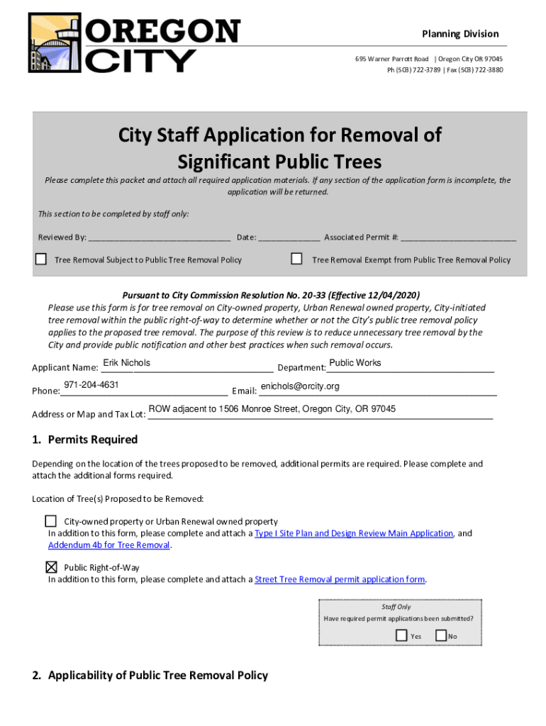 Planning Division 695 Warner Parrot Road | Oregon City OR 97045 pH (503) 7223789 | Fax (503) 7223880City Staff Application for Removal of Significant Public Trees Please complete this packet and attach