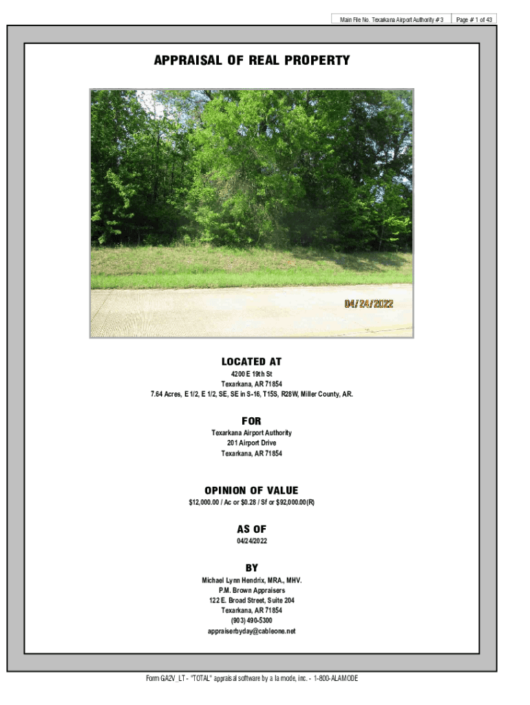 Main File No. Texarkana Airport Authority #3APPRAISAL OF REAL PROPERTYLOCATED AT 4200 E 19th St Texarkana, AR 71854 7.64 Acres, E 1/2, E 1/2, SE, SE in S16, T15S, R28W, Miller County, AR.FOR Texarkana
