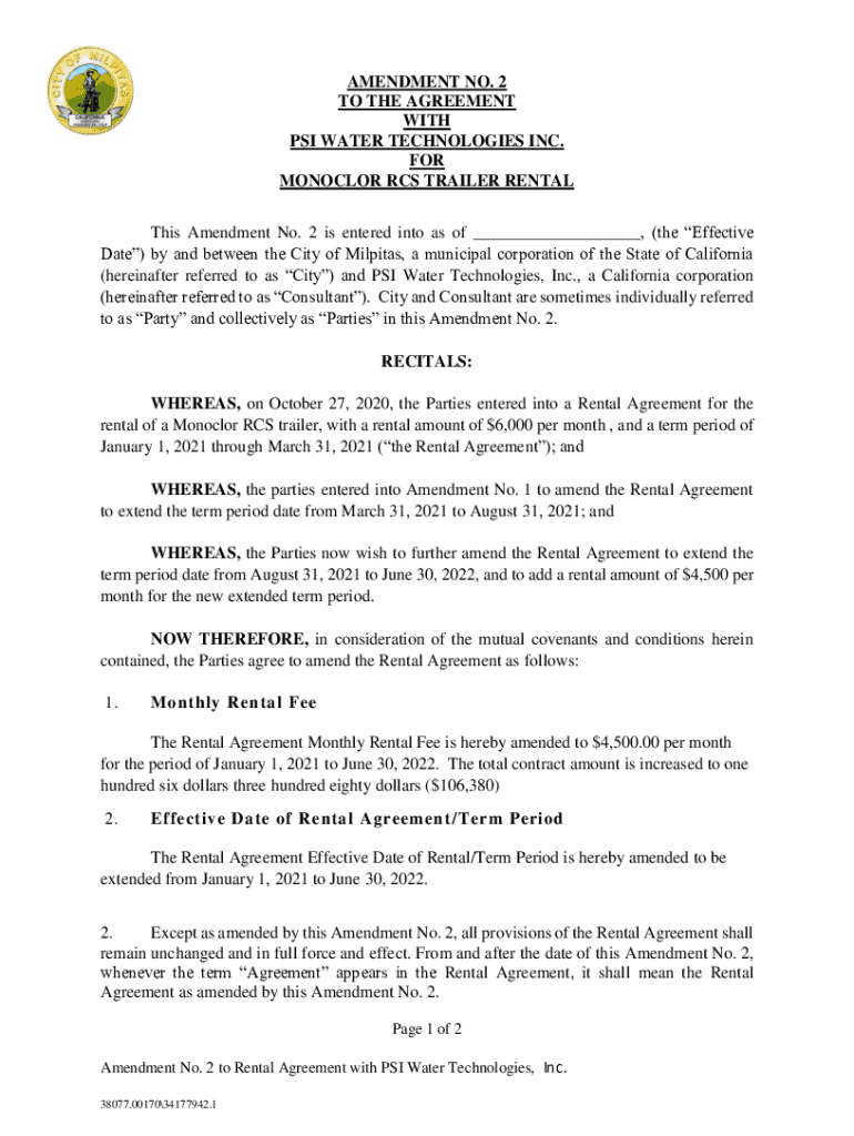 AMENDMENT NO. 2 TO THE AGREEMENT WITH PSI WATER TECHNOLOGIES INC. FOR MONOCLE RCS TRAILER RENTAL This Amendment No. 2 is entered into as of ___, (the Effective Date) by and between the City of Milpitas,