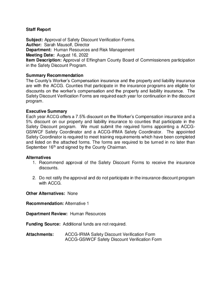 Staff Report Subject: Approval of Safety Discount Verification Forms. Author: Sarah Muscle, Director Department: Human Resources and Risk Management Meeting Date: August 16, 2022, Item Description: