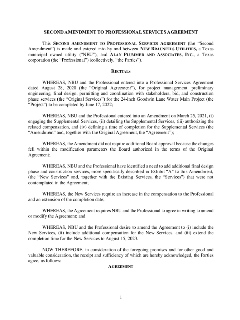 SECOND AMENDMENT TO PROFESSIONAL SERVICES AGREEMENT This SECOND AMENDMENT TO PROFESSIONAL SERVICES AGREEMENT (the Second Amendment) is made and entered into by and between NEW BRAUNFELS UTILITIES,