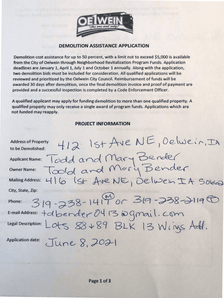 To fill out the application, applicants must provide information about the property to be demolished, the reason for demolition, and requested assistance.