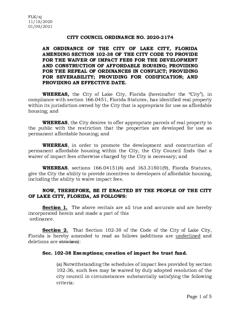 FLK/AJ 11/18/2020 01/08/2021CITY COUNCIL ORDINANCE NO. 20202174 AN ORDINANCE OF THE CITY OF LAKE CITY, FLORIDA AMENDING SECTION 10238 OF THE CITY CODE TO PROVIDE FOR THE WAIVER OF IMPACT FEES FOR