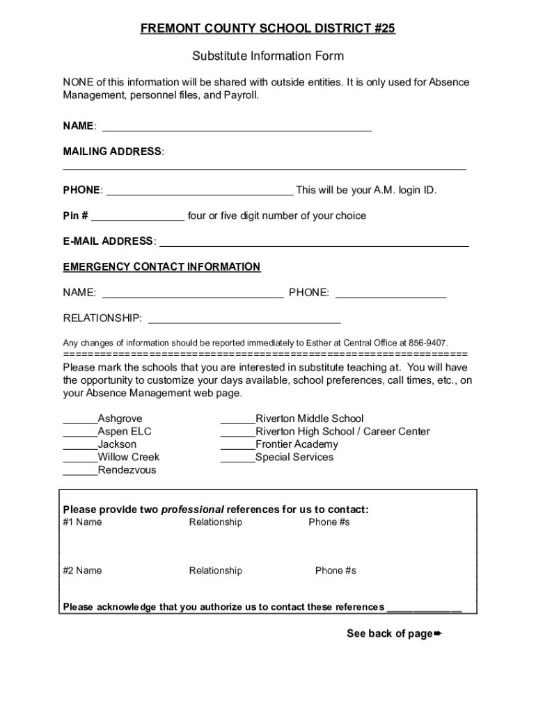 FREMONT COUNTY SCHOOL DISTRICT #25 Substitute Information Form NONE of this information will be shared with outside entities. It is only used for Absence Management, personnel files, and Payroll.