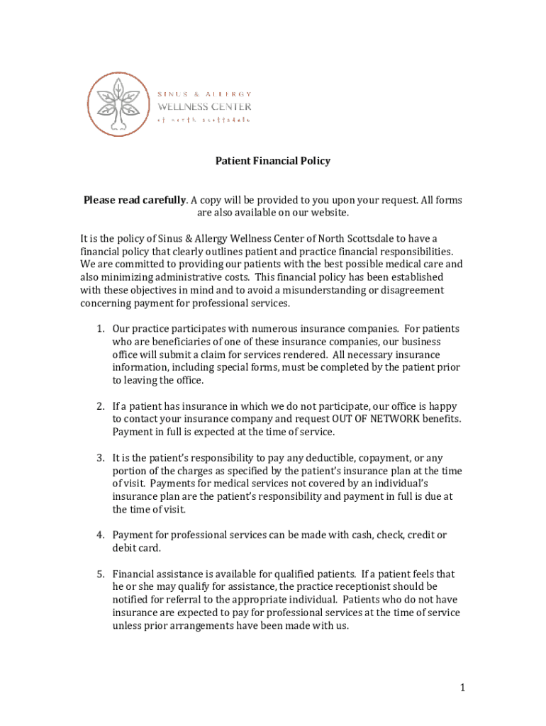 1 patient financial policy is a set of guidelines and procedures related to the financial aspects of patient care, including billing, insurance, payment options, and financial assistance programs.